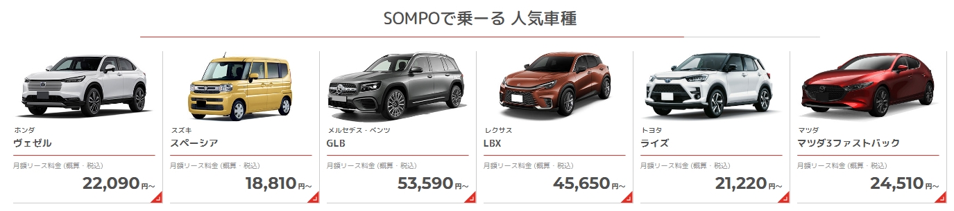 最大のメリットは、 月々の支払いを一定にできる点です。 また「SOMPOで 乗るーる」なら国内で販売している全メーカー・車種からお好きなクルマを選べます。