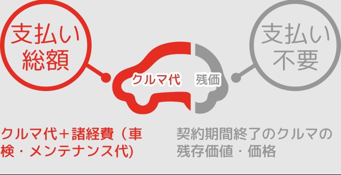 カーリースの特徴としては、 設定残存価格 (リース期間満了時の予想車両価格 (残価))を差し引いたクルマ代をリース期間中、 月々定額でお支払 いいただくので、 現金・ローン購入のように車両価格全額を支払う必要はありません。